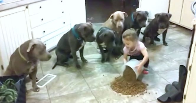 In it, we watch as a 4-year-old girl spreads out dinner on the floor as 6 pit bulls wait patiently for her instructions. They are so disciplined that they are able to resist rushing in for the food, despite smelling it right in front of them.