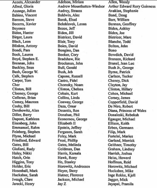 The list is a who’s who of politics, royalty, and entertainment. It includes Donald Trump, Bill Gates, Barack and Michelle Obama, Benjamin Netanyahu, Princess Diana, Bill and Hillary Clinton, as well as stars like Barbara Streisand, Amy Schumer, Bruce Springsteen, Kim Kardashian, Bill Cosby, and Robert De Niro. Even deceased icons Janis Joplin and Elvis Presley were included.