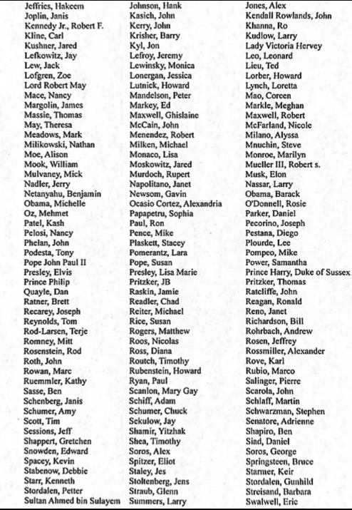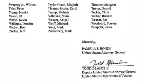 Bondi’s letter, released on February 14, also included a compilation of individuals “who are or were a government official or politically exposed person” and who were referenced at least once in the files.