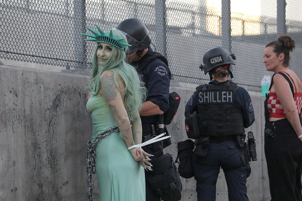Over the weekend, one image from the Los Angeles “No Kings” protest has been making waves across social media. The photo shows a protester dressed as the Statue of Liberty being handcuffed by police in riot gear, her torch confiscated.