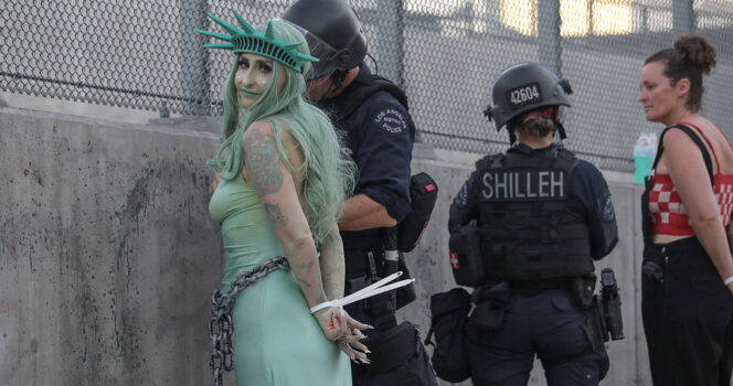 Over the weekend, one image from the Los Angeles “No Kings” protest has been making waves across social media. The photo shows a protester dressed as the Statue of Liberty being handcuffed by police in riot gear, her torch confiscated.