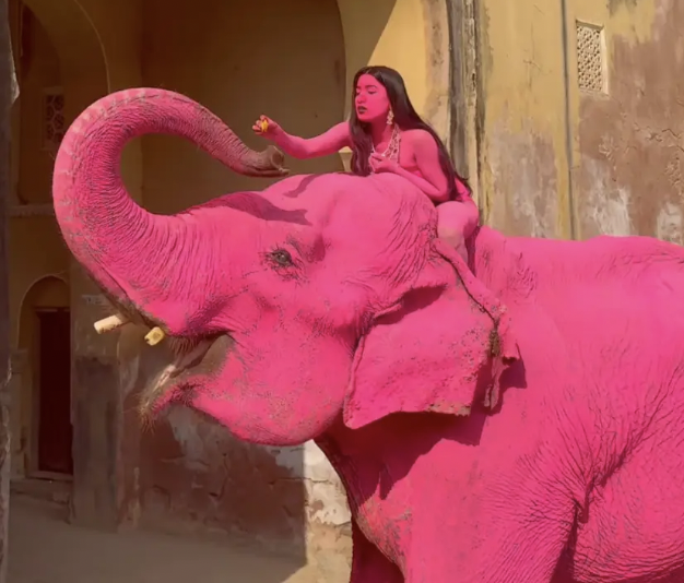 In November 2025, Russian photographer Julia Buruleva staged a photoshoot at an abandoned Ganesha temple in Jaipur, India, featuring a model and an elephant both painted in a bold, solid shade of pink.
